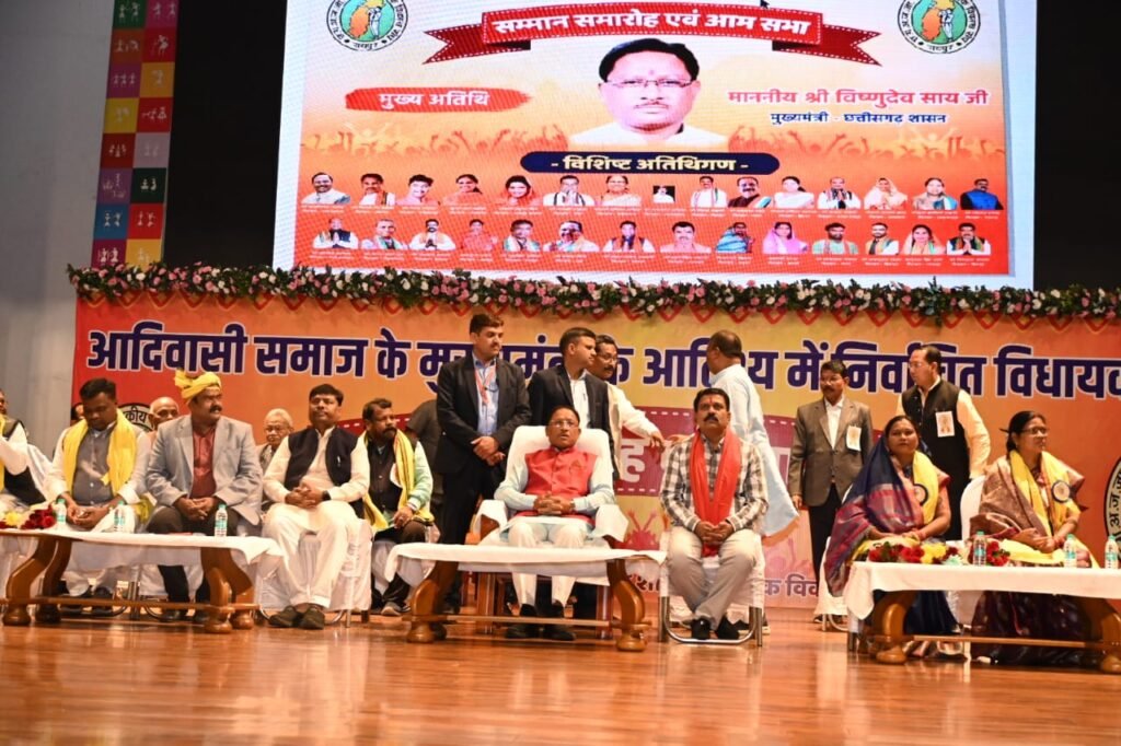 मुख्यमंत्री श्री विष्णु देव साय आज राजधानी रायपुर स्थित पंडित दीनदयाल उपाध्याय ऑडिटोरियम में अनुसूचित जनजाति शासकीय सेवक विकास संघ द्वारा आयोजित आदिवासी समाज के नवनिर्वाचित विधायकों के सम्मान समारोह एवं आमसभा में शामिल हुए। मुख्यमंत्री श्री साय ने दीप प्रज्ज्वलित कर समारोह की शुरुआत की। इस अवसर पर सर्व आदिवासी समाज द्वारा मुख्यमंत्री का स्वागत गजमाला एवं पगड़ी पहनाकर पारंपरिक आदिवासी स्वागत गीत से किया गया।