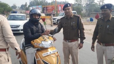 पुलिस अधीक्षक ने लोगों को ट्रैफिक नियमों की जानकारी देते हुए बांटे गुलाब फूल और हेलमेट