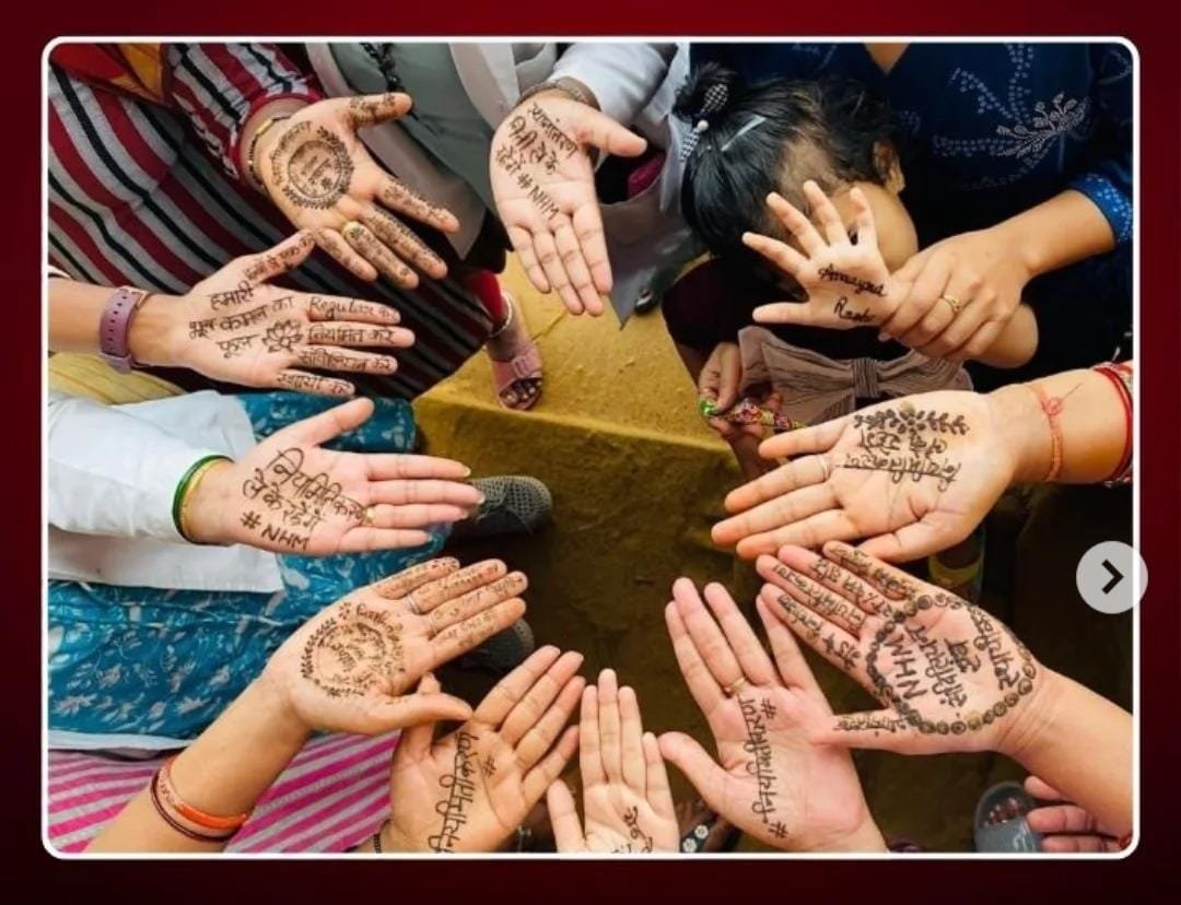 एनएचएम कर्मचारी 18 अगस्त से अनिश्चितकालीन हड़ताल पर है,और हर दिन अनूठे अंदाज मे अपनी मांगे राज्य सरकार से मनवाने का प्रयास कर रहे है,आज हड़ताल के 8 वें दिन हाईटेक न्यू बस स्टैंड सूरजपुर मे धरनास्थल पर एनएचएम की महिला कर्मचारियो ने तीज से पहले हाथों मे मेंहदी लगाकर सरकार से मांगे पूरी करने गुहार लगाई.