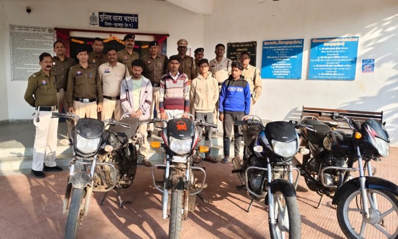 पूछताछ पर दुर्गा पूजा के समय ग्राम करौटी एवं ग्राम दवना से भी अलग-अलग समय पर 2 मोटर सायकल हीरो एचएफ डिलक्स, बजाज प्लेटिना सीडी 100 को आरोपी कबाडी प्रिंस सोनी से जप्त कर इस्तगासा क्रमांक 02/25 धारा 35-(1)(3)बीएनएसएस के तहत वाहन मालिक का पतासाजी किया जा रहा है। सभी आरोपियों से पूछताछ करने पर पता चला उनके द्वारा संगठित रूप से सार्वजनिक स्थान, मुख्य बाजार व रात्रि में घर के बाहर खडे वाहनों को चोरी कर कबाडी के पास खपातेे थे। इन आरोपियों के विरूद्ध जिला सरगुजा एवं सूरजपुर के अन्य थाना चौकी में अपराध दर्ज है जहां उन्हें चालान किया जा चुका है। मामले में 4 मोटर सायकल कीमत करीब 2 लाख 50 हजार रूपये का जप्त कर आरोपी (1) शुभम सोनी पिता कालीचरण सोनी उम्र 22 वर्ष (2) आकाश कुमार चौबे पिता स्व. श्याम किशोर चौबे उम्र 26 वर्ष दोनों निवासी जंगलपारा जरही थाना भटगांव (3) दीपक कुमार केवंट पिता स्व. सदानंद उम्र 25 वर्ष निवासी उर्जा नगर जरही, थाना भटगांव (4) प्रिंस सोनी पिता मनोज सोनी उम्र 18 वर्ष 8 महीना निवासी ग्राम खैरबार थाना कोतवाली अम्बिकापुर को गिरफ्तार किया गया है।