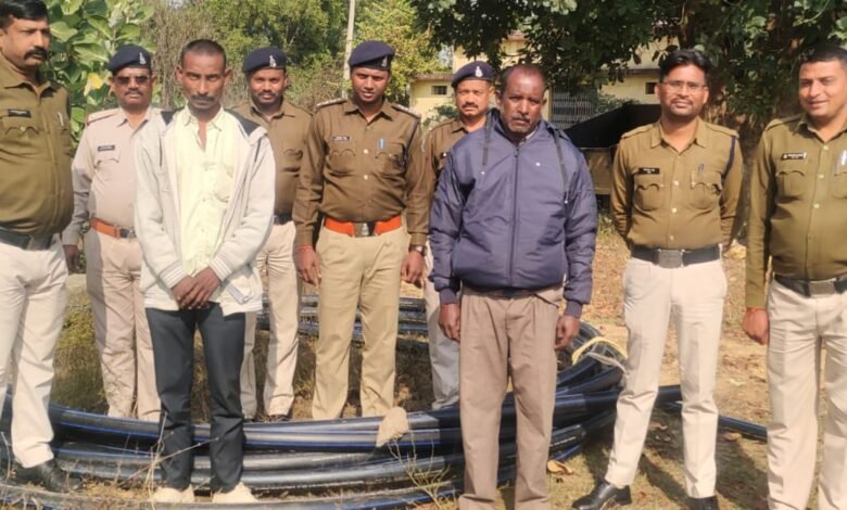 अतिरिक्त पुलिस अधीक्षक शोभराज अग्रवाल व डीएसपी रितेश चौधरी के मार्गदर्शन में थाना भटगांव पुलिस ने आरोपियों की पतासाजी के दौरान मुखबीर ने सूचना दिया कि ग्राम लक्ष्मीपुर के बेचन सिंह के बाड़ी एचडीपी पाईप लगा है जिसके बाद उसे दबिश देकर पकड़ा गया। पूछताछ पर बेचन सिंह ने बताया कि चोरी के पाईप को गौरीशंकर से खरीदी कर बाड़ी में लगाया था। जिसके बाद पुलिस ने गौरीशंकर को भी दबिश देकर पकड़ा। आरोपियों के निशानदेही पर चोरी का 85 मीटर एचडीपी पाईप को जप्त कर आरोपी बेचन सिंह पिता स्व. श्रीराम उम्र 55 वर्ष ग्राम लक्ष्मीपुर व गौरी शंकर पिता जगसाय ग्राम लक्ष्मीपुर, थाना भटगांव को गिरफ्तार किया गया। इस कार्यवाही में थाना प्रभारी भटगांव राजेन्द्र साहू, एसआई अश्वनी पाण्डेय, एएसआई लालचंद कुजूर, प्रधान आरक्षक पूरनचंद राजवाड़े, रविनंद सिंह, शत्रुधन पोर्ते, आरक्षक विनोद प्रताप सिंह, संतोष जायसवाल, मनोज जायसवाल, भोलाशंकर व राधेश्याम साहू सक्रिय रहे।