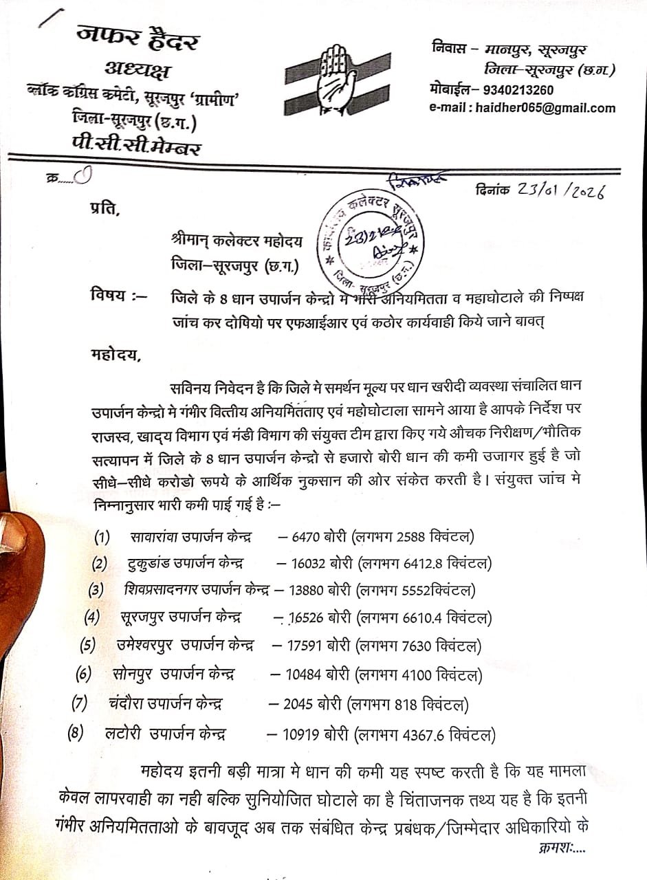 सूरजपुर :– जिले में तमाम धान खरीदी केन्द्रों में से 8 धान उपार्जन केन्द्रों में भारी अनियमितता व महाघोटाले की निष्पक्ष जांच कराने एवं दोषियों पर एफआईआर दर्ज कराकर कठोर कार्यवाही कराने ब्लॉक कांग्रेस अध्यक्ष जफर हैदर ने कलेक्टर को ज्ञापन सौंपकर इस मामले में जांच कराने की मांग की है प्रशासन द्वारा संयुक्त टीम ने जांच के दौरान पाया कि जिले के सावारावा उपार्जन केन्द्र में 6470 बोरी लगभग 2588 क्विंटल,टुकूडांड उपार्जन केन्द्र में 16032 बोरी लगभग 6412.8 क्विंटल,शिवप्रसादनगर उपार्जन केन्द्र में 13880 बोरी लगभग 5552 क्विंटल,सूरजपुर उपार्जन केन्द्र में 16526 बोरी लगभग 6610.4 क्विंटल,उमेश्वरपुर उपार्जन केन्द्र में 17591 बोरी लगभग 7630 क्विंटल,सोनपुर उपार्जन केन्द्र में 10484 बोरी 4100 क्विंटल,चंदौरा उपार्जन केन्द्र में 2045 बोरी लगभग 818 क्विंटल,लटोरी उपार्जन केन्द्र में 10919 बोरी लगभग 4367.6 बोरी धान की कमी पायी गई है जफर हैदर ने बताया कि यह घोटाला केवल लापरवाही का नहीं है बल्कि सुनियोजित घोटाले का चिंताजनक तथ्य है।
