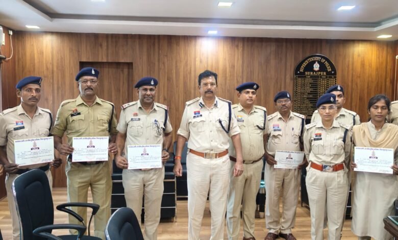 सूरजपुर :– डीआईजी व एसएसपी श्री प्रशांत कुमार ठाकुर ने स्थाई वारंटों को तामीली में उत्कृष्ट कार्य करने वाले पुलिस अधिकारी व जवानों को प्रशस्ति पत्र एवं नगद पुरस्कार से पुरस्कृत किया है। जिले की पुलिस टीम ने तत्परता से कार्य करते हुए ऐसे लोगों को गिरफ्तार किया जिनके खिलाफ अदालत ने स्थाई वारंट जारी किए थे और उन्हें पकड़कर कोर्ट में पेश किया। स्थाई वारंट तामीली से न्याय प्रणाली के कार्यो को मजबूती मिलती है और पीड़ितों को जल्द न्याय की राह आसान होती है।