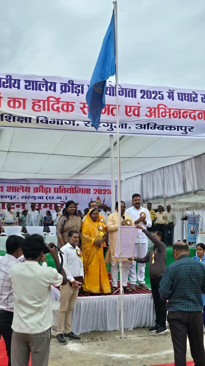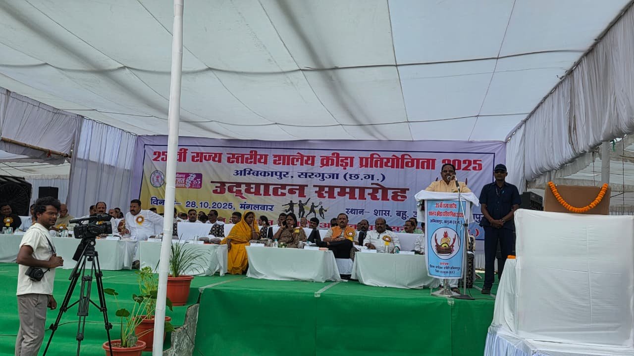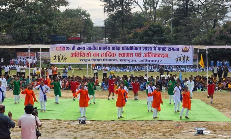 अंबिकापुर :– छत्तीसगढ़ शासन स्कूल शिक्षा विभाग द्वारा आयोजित 25वीं राज्य स्तरीय खेलकूद प्रतियोगिता 2025 का आज भव्य शुभारंभ अंबिकापुर के मल्टीपरपज स्कूल मैदान में हुआ। चार दिवसीय यह खेल महाकुंभ 28 से 31 अक्टूबर तक आयोजित होगा, जिसमें प्रदेश के विभिन्न संभागों से दुर्ग, रायपुर, बस्तर, बिलासपुर और मेजबान सरगुजा की टीमें भाग ले रही हैं।    कार्यक्रम का शुभारंभ मां सरस्वती के चित्र पर दीप प्रज्वलन, राजगीत, स्वागत गीत, ध्वजारोहण, गुब्बारा उड्डयन, आतिशबाजी एवं राष्ट्रगान के साथ हुआ। इसके बाद मार्च पास्ट का आयोजन किया गया, जिसका नेतृत्व फील्ड मार्शल शोभित दास गुप्ता ने किया। इसके उपरांत अतिथियों द्वारा खिलाड़ियों को शपथ दिलाकर प्रतियोगिता का औपचारिक शुभारंभ किया गया।    इस दौरान मुख्य अतिथि लुण्ड्रा विधायक श्री प्रबोध मिंज ने अपने उद्बोधन में कहा कि खेल हमें अनुशासन और एकता की सीख देते हैं। खेल भावना से खेला गया हर खेल सफलता का मार्ग प्रशस्त करता है। छत्तीसगढ़ में प्रतिभाशाली खिलाड़ियों की कमी नहीं है, जरूरत है तो उन्हें सही दिशा और अवसर देने की।