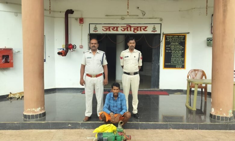 डीआईजी एवं एसएसपी सूरजपुर श्री एम.आर.आहिरे (भापुसे) ने चोरी सहित अन्य मामलों को गंभीरता से लेते हुए आरोपी की पतासाजी कर जल्द पकड़ने के निर्देश दिए। एएसपी संतोष महतो व एसडीओपी प्रतापपुर अरूण नेताम के मार्गदर्शन में चौकी खड़गवां की पुलिस ने संदेही रामलीला पिता आलमसाय उम्र 35 वर्ष निवासी केरता को पकड़ा। पूछताछ पर उसने चोरी की वारदात को अंजाम देना स्वीकार किया जिसके निशानदेही पर चोरी का सोलर पम्प कीमत 25500 रूपये को बरामद कर उसे गिरफ्तार किया है। इस कार्यवाही में चौकी प्रभारी योगेन्द्र जायसवाल, एएसआई सुनील भारती, प्रधान आरक्षक विनय व आरक्षक मनोज व विकास सक्रिय रहे।