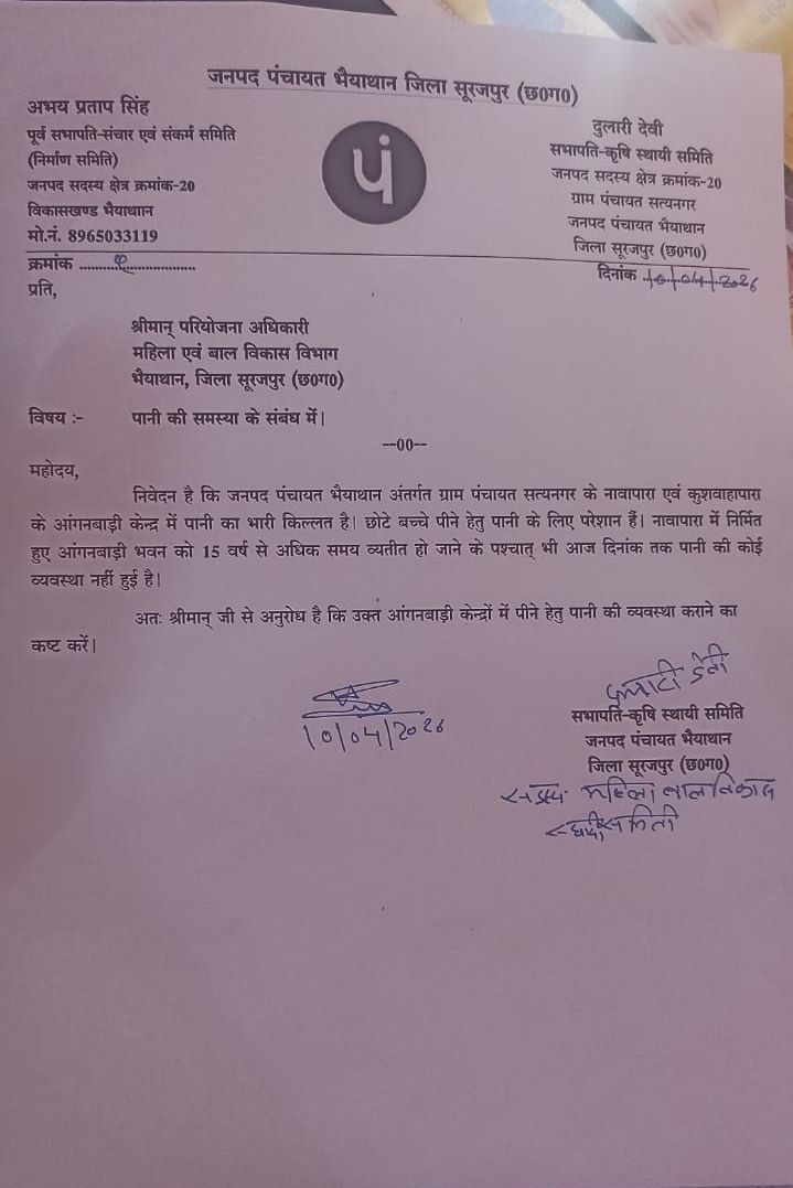 सूरजपुर/भैयाथान :– जनपद सदस्य प्रतिनिधि अभय प्रताप सिंह से मिली जानकारी के अनुसार जनपद पंचायत भैयाथान अंतर्गत ग्राम पंचायत सत्यनगर के नवापारा आंगनबाड़ी केंद्र में पिछले 15 वर्षों से पेयजल की कोई स्थायी व्यवस्था नहीं है। सरकारी दावों के विपरीत जमीनी हकीकत बेहद चिंताजनक है।       आंगनबाड़ी केंद्र छोटे बच्चों, गर्भवती महिलाओं और धात्री माताओं के लिए बेहद महत्वपूर्ण होते हैं, लेकिन यहां पानी जैसी बुनियादी सुविधा का अभाव साफ तौर पर लापरवाही को दर्शाता है।
