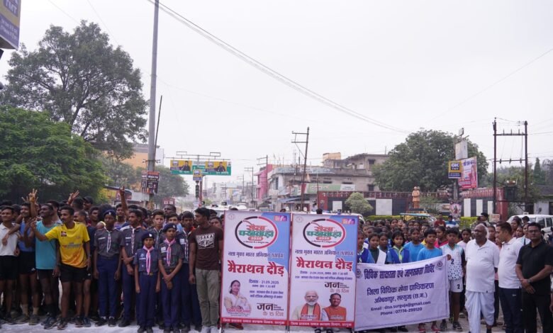 अंबिकापुर :– सेवा पखवाड़ा 2025 के अंतर्गत जिला प्रशासन एवं समाज कल्याण विभाग द्वारा नशा मुक्त भारत अभियान थीम पर जन-जागरूकता हेतु आज मिनी मैराथन दौड़ का आयोजन किया गया। इस दौड़ को सांसद श्री चिंतामणि महाराज एवं नगर पालिक निगम महापौर श्रीमती मंजूषा भगत ने लरंग साय चौक से हरी झंडी दिखाकर रवाना किया।