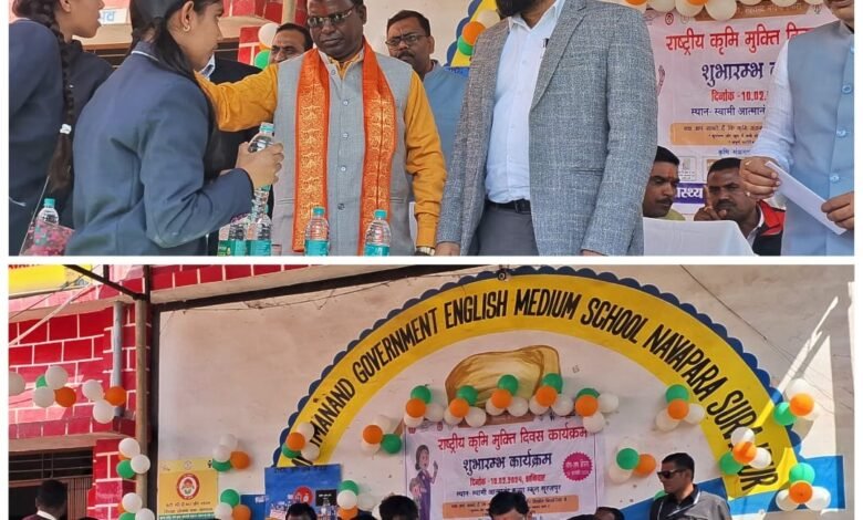 सूरजपुर जिला स्वास्थ्य विभाग द्वारा राष्ट्रीय कृमि मुक्ति दिवस कार्यक्रम का शुभारम्भ स्वामी आत्मानंद शासकीय उत्कृष्ट अंग्रेजी माध्यम विद्यालय नवापारा सूरजपुर में सम्पन्न हुआ। जिले के सभी स्कूल एवं आंगनबाड़ी आज राष्ट्रीय कृमि मुक्ति दिवस मनाया गया। जिसमें सभी बच्चों को एलवेण्डाजोल की गोली खिलायी गई व स्वास्थ्य संबंधित जानकारी एवं सुझाव प्रदान की गई।