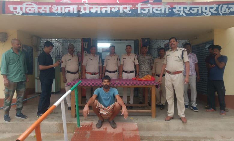 सूरजपुर। थाना प्रेमनगर पुलिस ने गड़ासा लहराकर लोगो को धमकाने वाले गुण्डा बदमाश को गिरफ्तार कर उसके खिलाफ आर्म्स एक्ट के तहत कार्यवाही कर गिरफ्तार किया है। उप पुलिस महानिरीक्षक/वरिष्ठ पुलिस अधीक्षक सूरजपुर श्री एम.आर.आहिरे (भा.पु.से.) ने जिले के पुलिस अधिकारियों को माहौल खराब करने वालों के विरूद्व सख्त कार्यवाही करने के निर्देश दिए है। इसी कड़ी दिनांक 07/04/2024 को थाना प्रेमनगर पुलिस को सूचना मिली कि ग्राम घुमाडांड में गुण्डा बदमाश सुरेश राम चौधरी लोहे का गड़ासा धारदार हथियार लेकर लहराते हुए आम जनता को  धमकी देकर भयभीत कर रहा है।