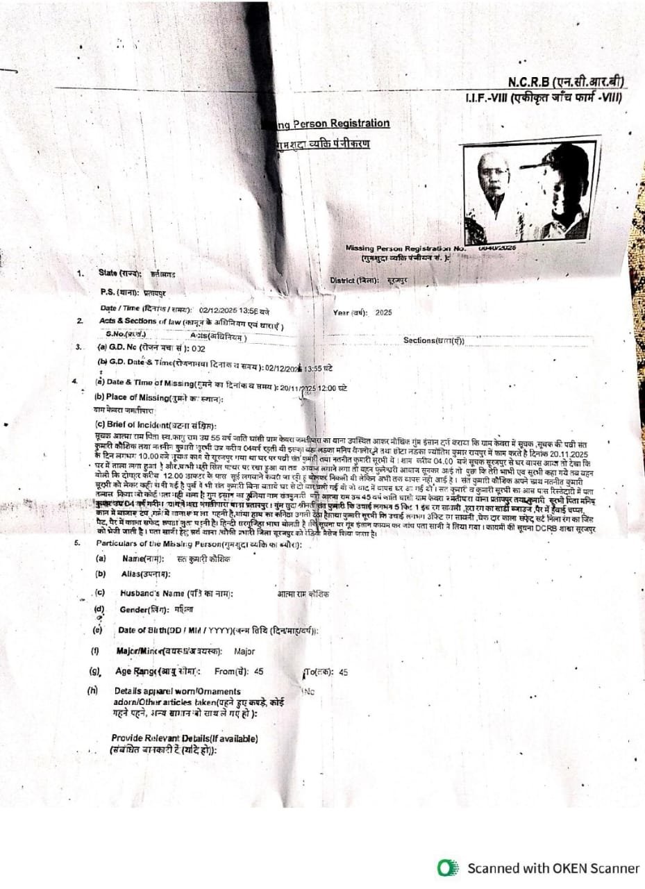 थाने में रिपोर्ट दर्ज कराई कि उनकी पत्नी संत कुमारी कौशिक, उम्र करीब 35 वर्ष, साथ में नतनीन उम्र लगभग 4 वर्ष नाम सुरभि दिनांक 20 नवंबर को अचानक घर से लापता हो गईं। आत्मा कौशिक ने रिपोर्ट में लिखवाया कि सुबह लगभग 10 बजे मै काम से सूरजपुर गया था और शामको लगभग 4 बजे के आसपास जब वापस लौटा तो देखा कि घर में ताला लगा हुआ था और उनकी पत्नी नतनीन घर पर मौजूद नहीं थी।