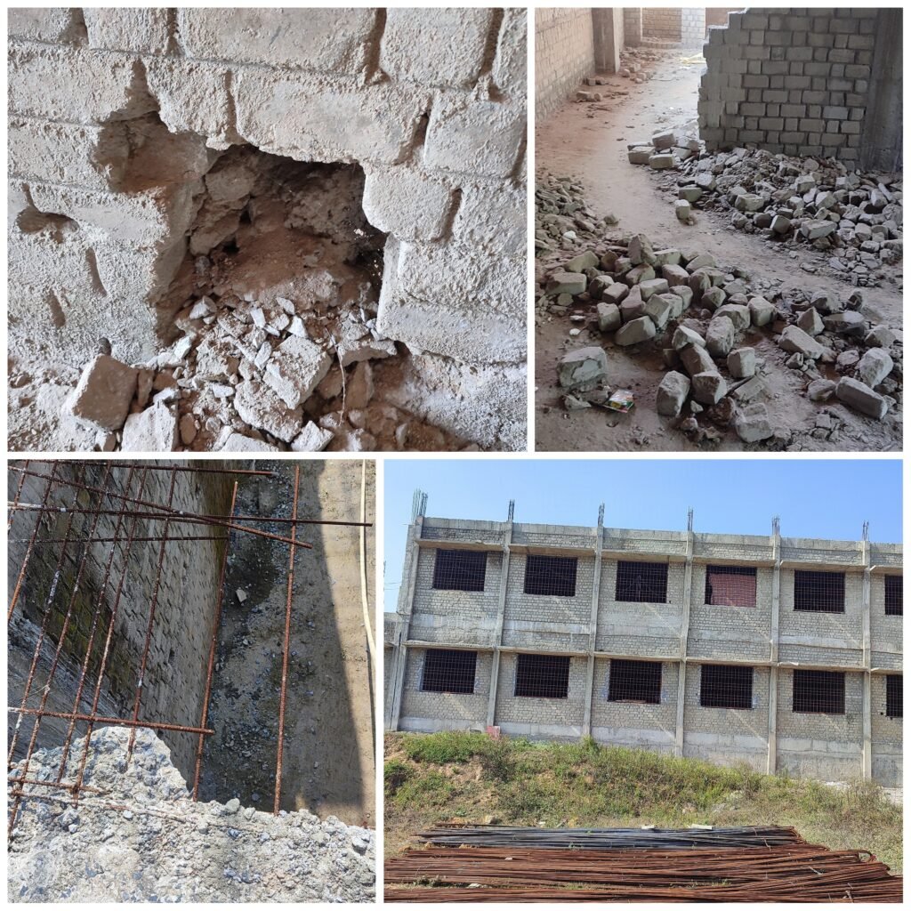 जहां प्लिंथ लेबल के कार्यो में भारी अनियमितताएं की गई है, वही न दिवालो के लिए किये D.P.C.का हाल तो पूर्णतः बेहाल है और तो फर्श के लिए किये जाने वाली मिट्टी पटाई के कार्यों में क्युरिंग यानी पानी तराई नही होने से फर्श का कार्य भी भगवान भरोसे है व बालु ऐसा डाला जा रहा है जो संपूर्ण रुप से मिट्टी है एवं जो ईंट प्रयोग किया जा रहा है वह भी मानक स्तर का नहीं है और तो और ऐसे मसालो का उपयोग किया जा रहा है जो कि निम्न स्तर का है अब बात की जाए सरिये (राड)कि तो जितना व जिस अनुपात में लगाया जाना है उसमें भी जमके भ्रष्टाचार किया जा रहा है, कुल मिलाकर यह कहा जा सकता है कि यहां रहने वाले छात्र-छात्राओं के भविष्य में खतरा मंडरा रहा है।देखना यह है कि इन सारे खुलासे के बाद विभाग के जिम्मेदारों के ऊपर कोई कार्रवाई होती है या नही।