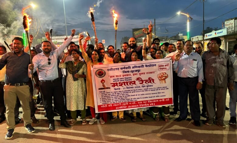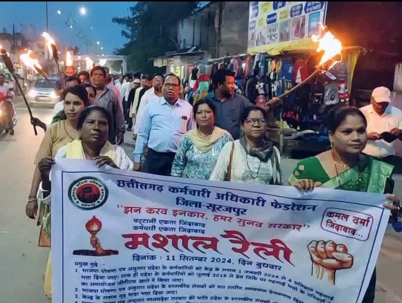 सूरजपुर:– कर्मचारी अधिकारी फेडरेशन के द्वारा चार सुत्रीय मांग को लेकर मशाल रैली निकाल मुख्यमंत्री के नाम ज्ञापन सौंपा गया,जहां फेडरेशन के द्वारा कहा गया कि पूर्व में भी अपनी मांगों को लेकर अधिकारियों, जनप्रतिनिधियों को ज्ञापन सौंप चुके हैं लेकिन हमारी मांगों पर सरकार द्वारा कोई पहल नहीं किया गया है।