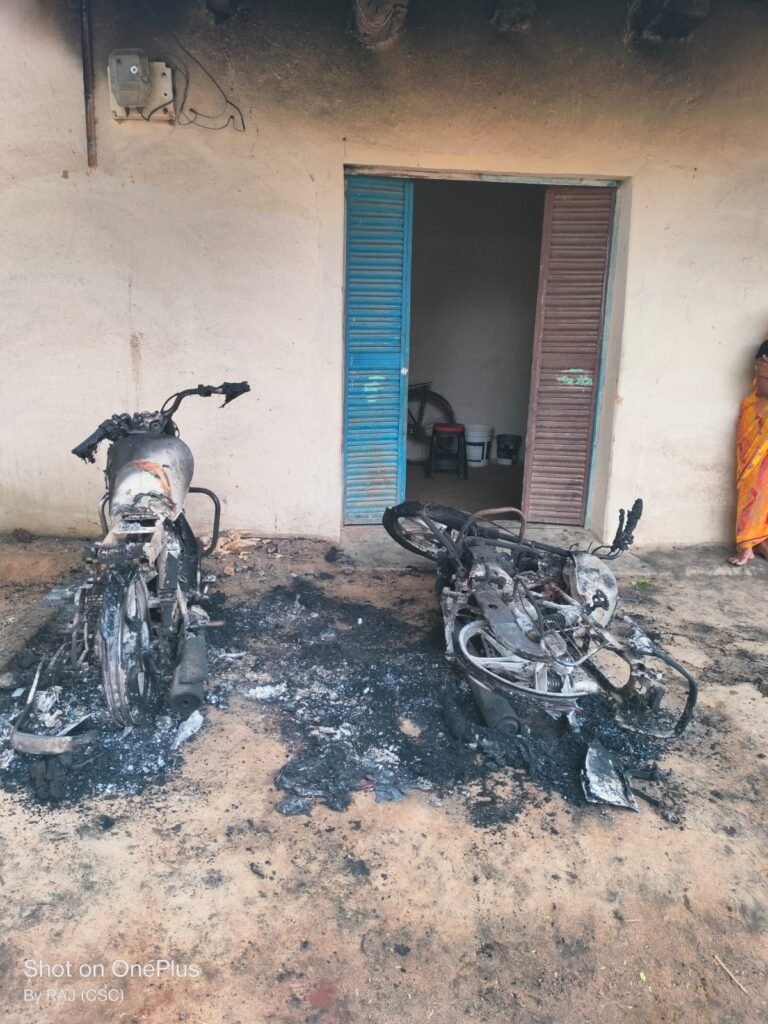 जानकारी के अनुसार ग्राम निवासी हरिशंकर पिता राम प्रसाद के घर के बाहर खड़ी दो मोटरसाइकिलें — क्रमांक CG15 DK 8633 और CG29 AC 0953 — बीती रात लगभग 1:30 बजे अज्ञात व्यक्ति ने आग के हवाले कर दीं। अचानक लगी आग की लपटें देखकर घरवाले व आसपास के लोग मौके पर पहुंचे और आग बुझाने का प्रयास किया, लेकिन तब तक दोनों वाहन पूरी तरह जलकर खाक हो गए।