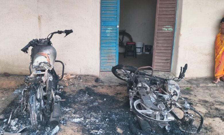 घर के बाहर खड़ी दो मोटरसाइकल में अज्ञात उपद्रव ने लगाई आग