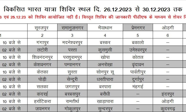 *सूरजपुर* विकसित भारत संकल्प यात्रा के आगामी शिविरो अपका आयोजन विभिन्न चयनित स्थलों में दिनांक 26  दिसंबर से 30 दिसंबर तक किया जाना है। जिसके अंतर्गत सूरजपुर, रामानुजनगर, भैयाथान, प्रेमनगर, ओड़गी, प्रतापपुर ब्लॉक में 10ः00 बजे और 02ः00 बजे की दो पाली में विकसित भारत संकल्प यात्रा के 50 शिविर कार्यक्रम का आयोजन होना है।