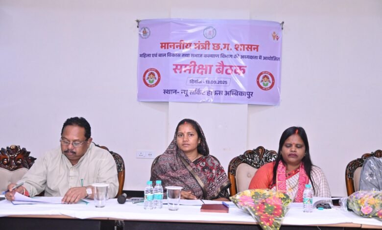 अंबिकापुर :– महिला एवं बाल विकास तथा समाज कल्याण मंत्री श्रीमती लक्ष्मी राजवाड़े ने सरगुजा संभाग के प्रवास के दौरान आज अंबिकापुर सर्किट हाउस में विभागीय समीक्षा बैठक ली। उन्होंने बैठक में महिला एवं बाल विकास और समाज कल्याण विभाग से संबंधित योजनाओं एवं कार्यक्रमों की प्रगति की विस्तृत समीक्षा की गई।